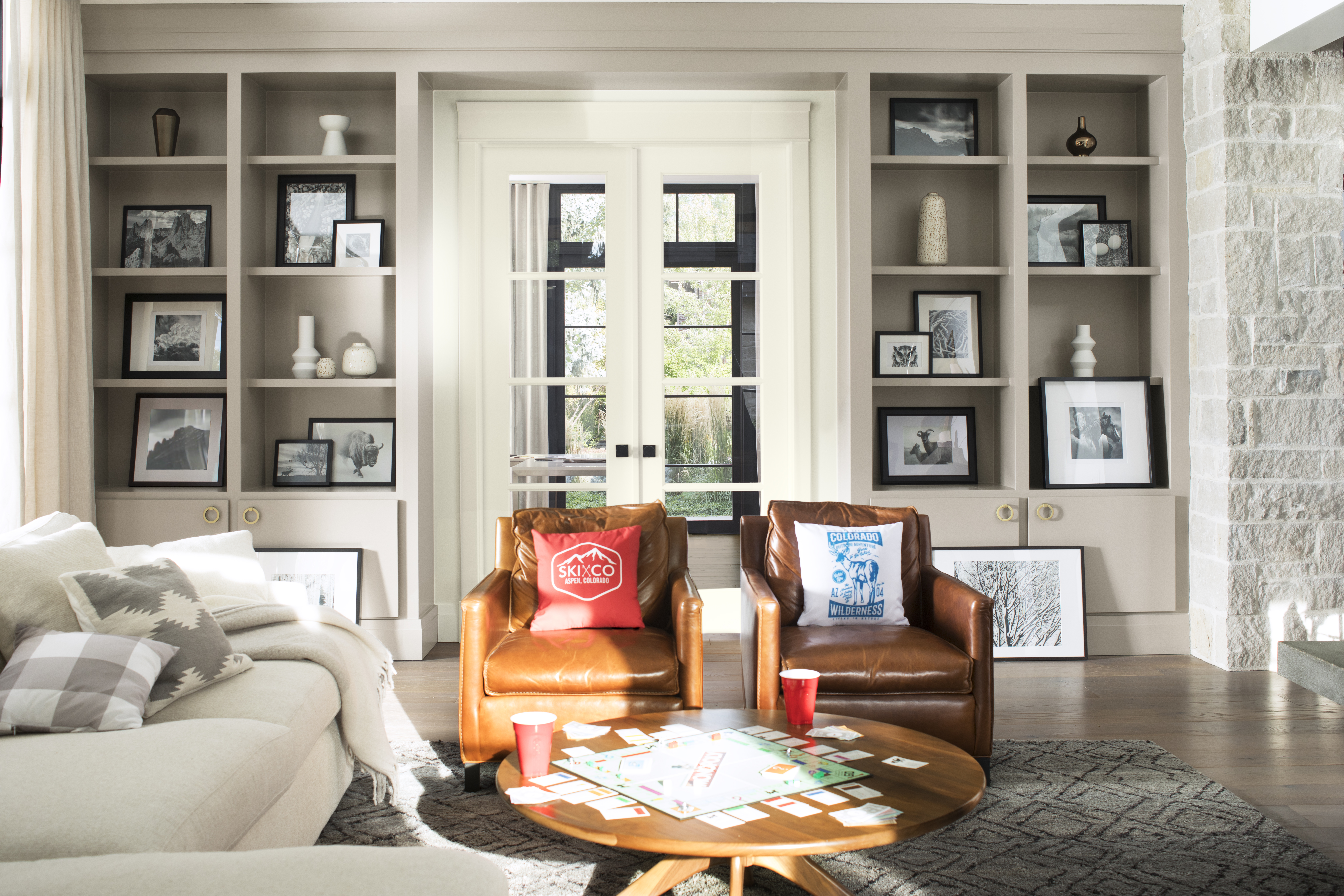 (WALL & TRIM) Alabaster OC-129, Solid Woodluxe, (CEILING & DOORS) Teak ES-30, Woodluxe Translucent